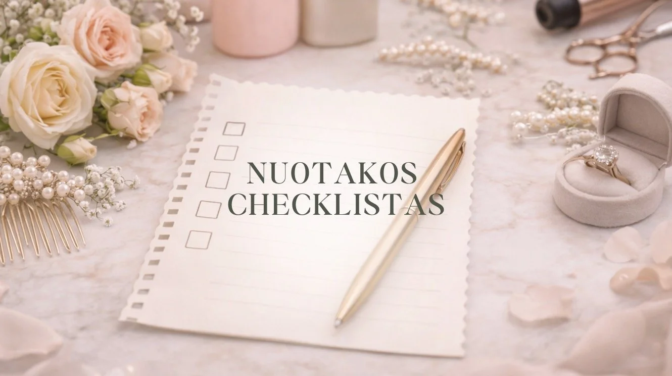 Šis nuotakos checklistas parengtas pagal profesionalų praktiką – tam, kad vestuvių dieną galėtum atsipalaiduoti ir pasitikėti procesu.